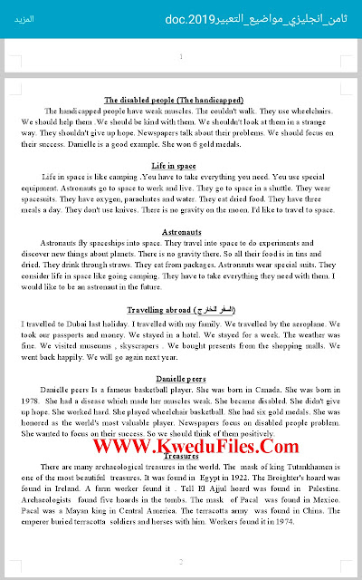 ورقتين في مادة اللغة الانكليزية للصف الثامن للكورس الاول تتضمنمواضيعالتعبير لعام2019