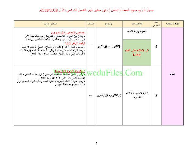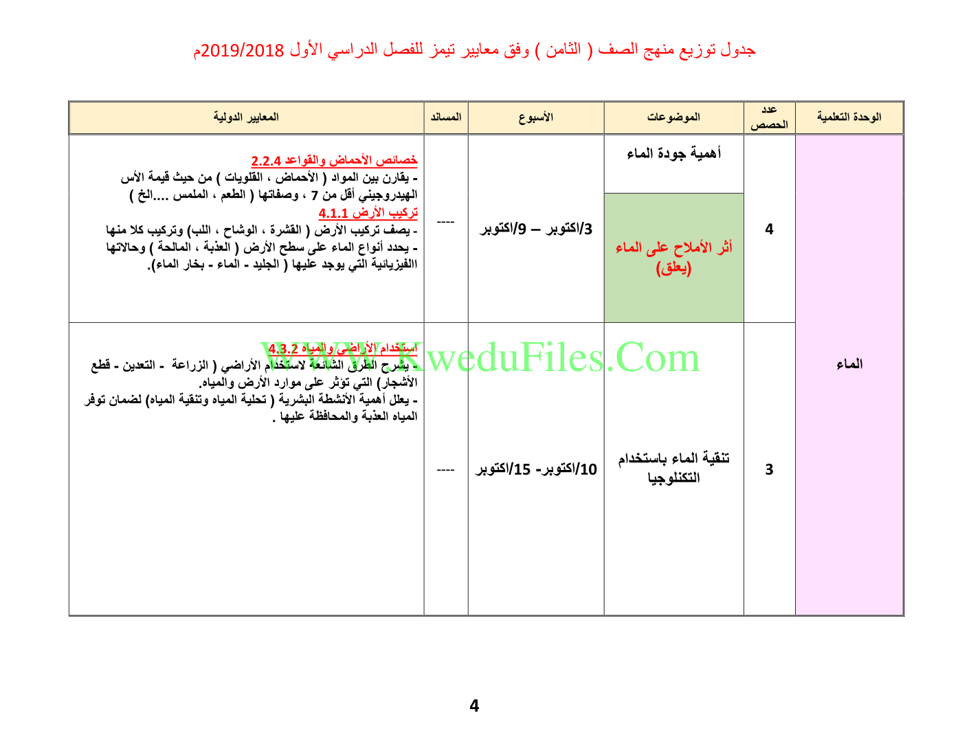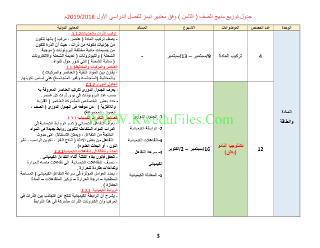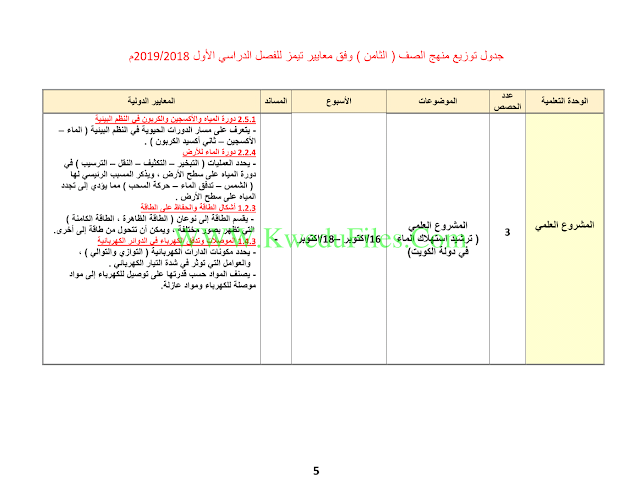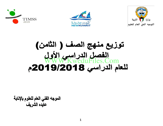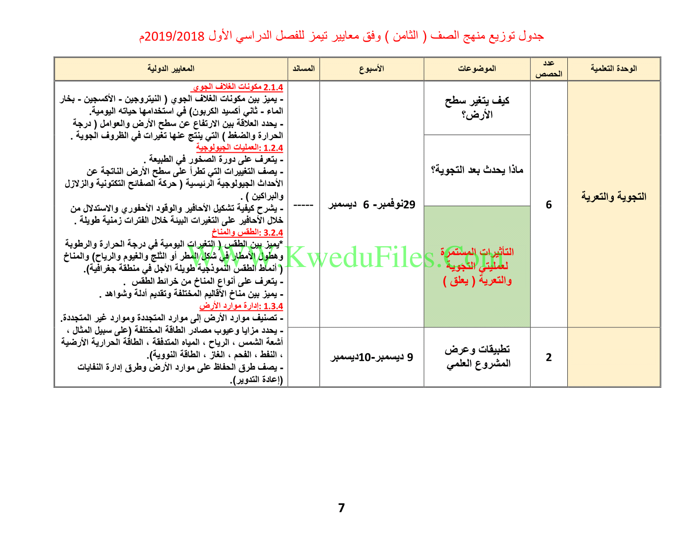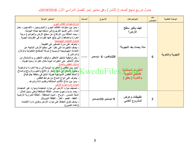 7اوراق في مادة العلوم للصف الثامن للكورس الاول تتضمن خطة توزيع المنهج لعام 2019