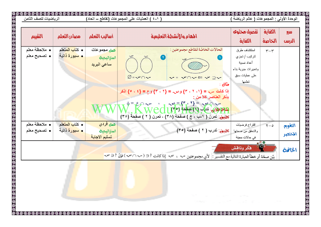 تحضير بند 1_4العمليات على المجموعات في مادة الرياضيات, الصف الثامن, رياضيات, الفصل الأول, 2018-2019 - المناهج الكويتية