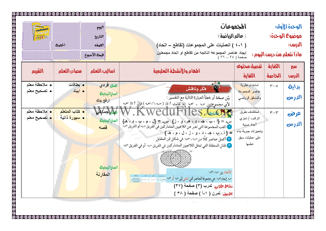 معلومات الملف: ورقتين في مادة الرياضيات للصف الرابع للكورس الاول منهج جديد تتضمن تحضير درس العمليات على المجموعات ح2 | ||