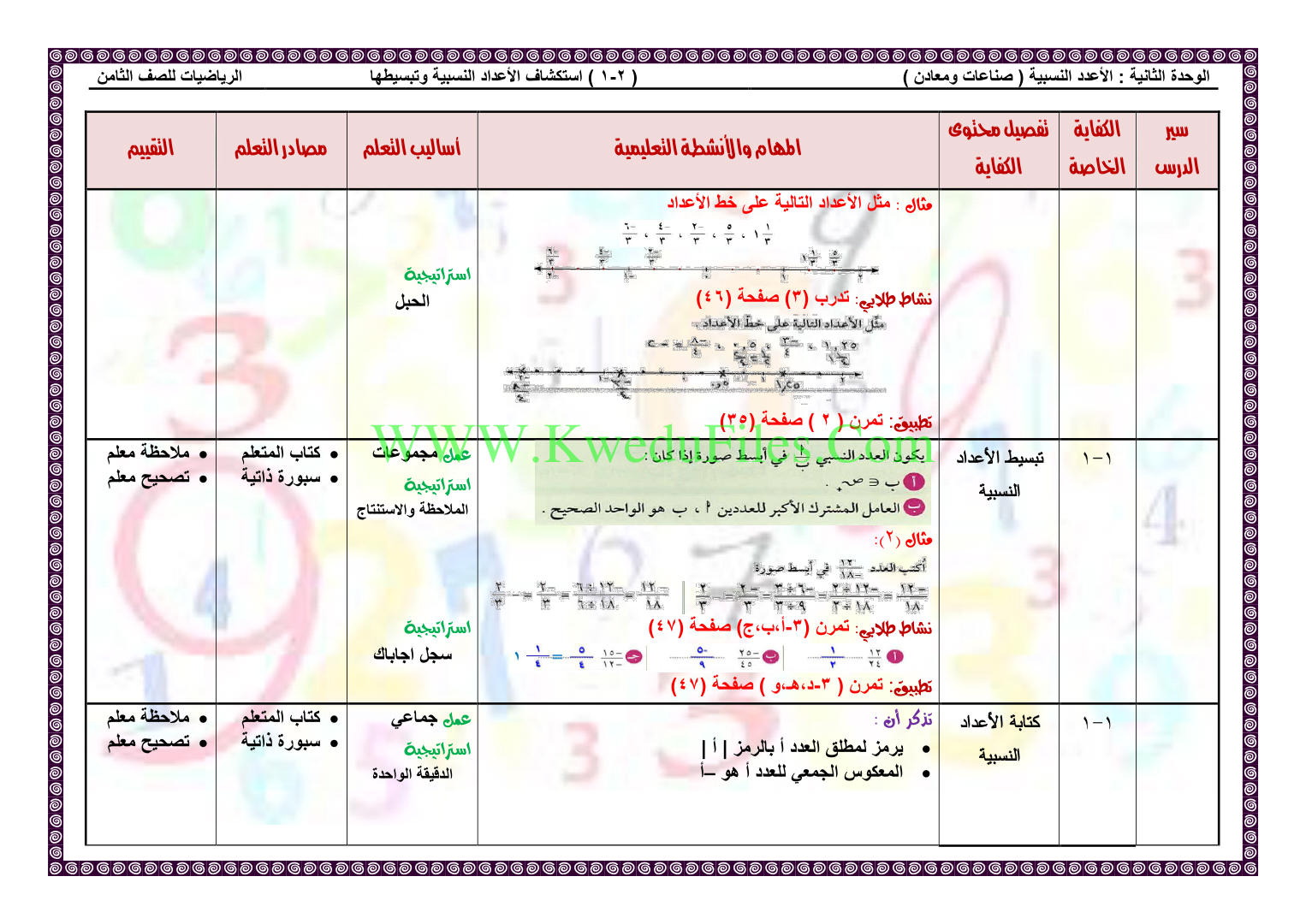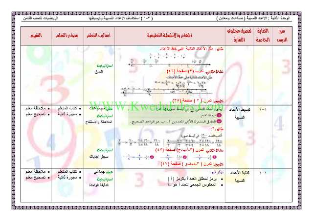 معلومات الملف: 4اوراق في مادة الرياضيات للصف الثامن للكورس الاول تتضمن تحضير درس استكشاف الاعداد النسبية وتبسيطها | ||