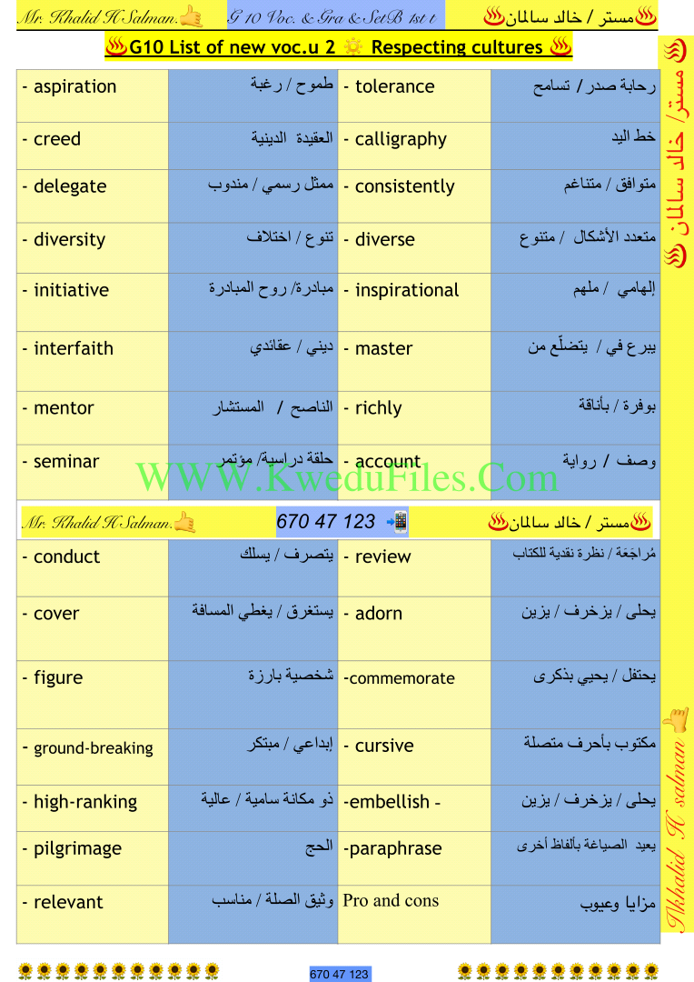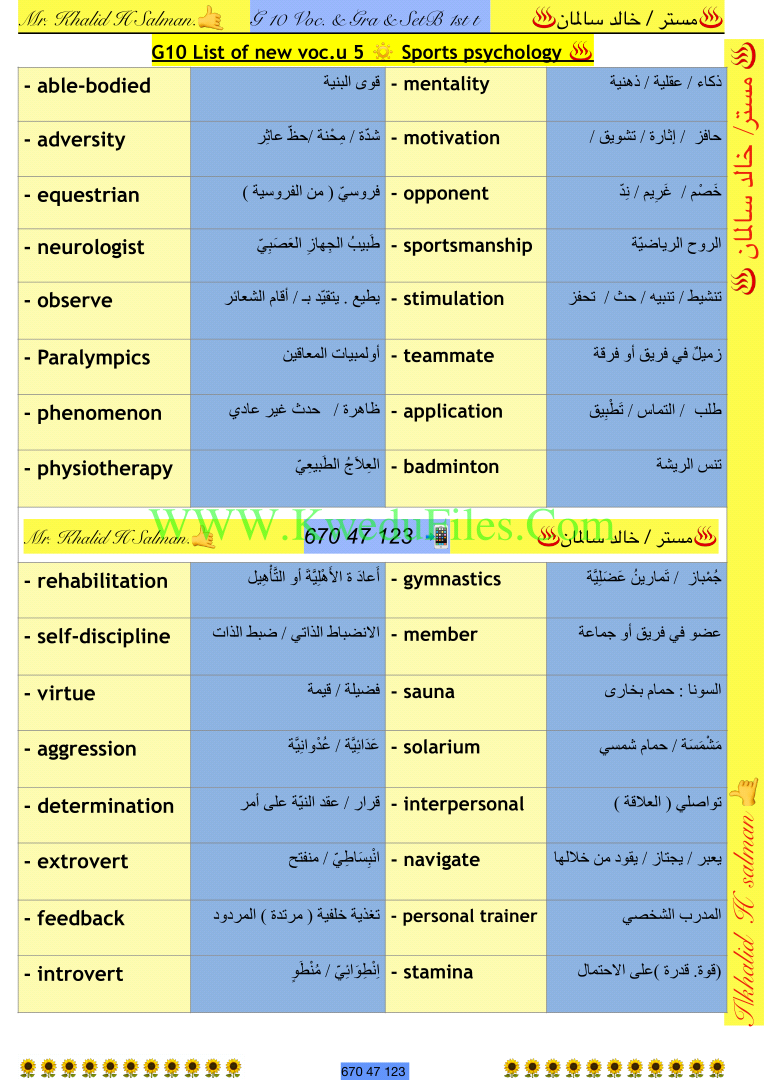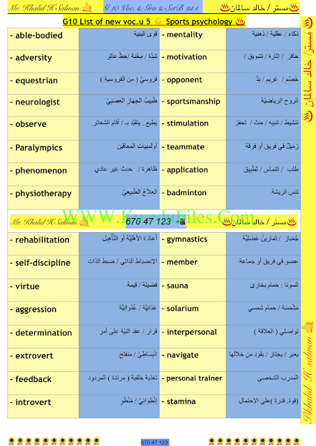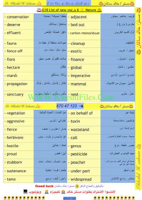 معلومات الملف: 6اوراق في مادة اللغة الانكليزية للصف العاشر للكورس الاول تتضمن الكلمات الجديدة للوحدات1_6من اعداد الاستاذ خالد السالمان | ||