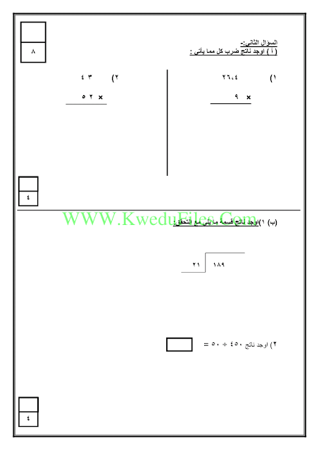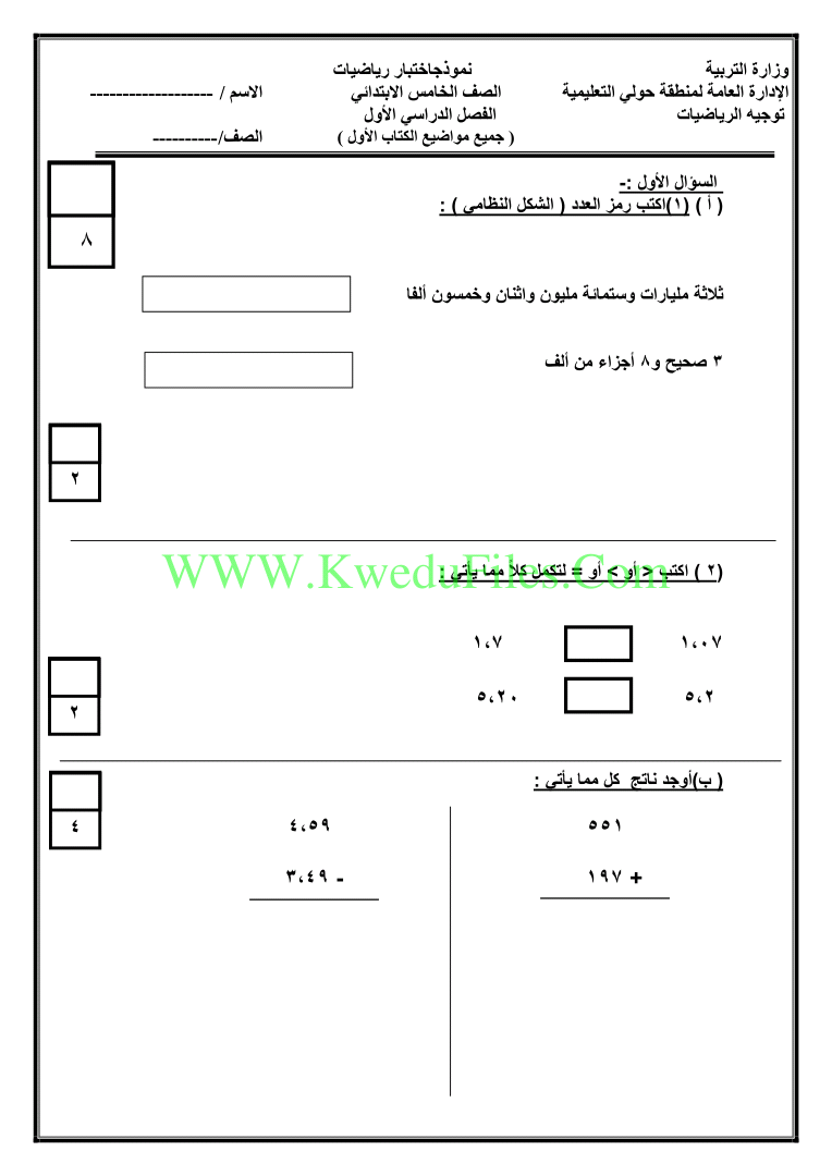 15. الصف الرابع, رياضيات, نموذج اختبار تقويمي أول