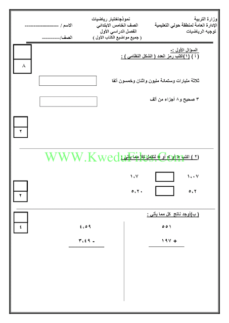1. الصف الخامس, رياضيات, إجابة اختبار تقويمي أول لترتيب وتقريب الأعداد الكبيرة