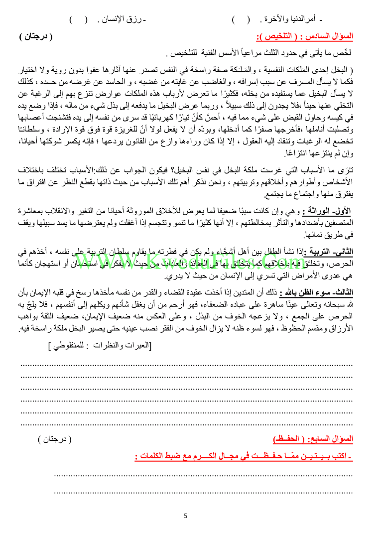5. لغة عربية, الفصل الأول, 2025/2026, نماذج الاختبار القصير الثاني من العشماوي