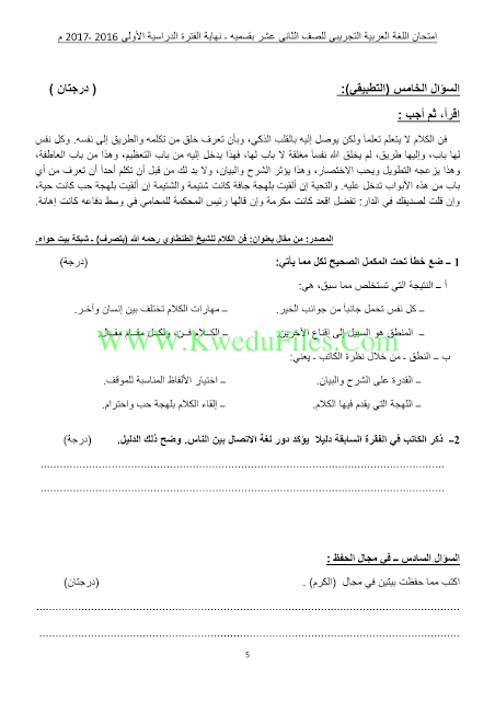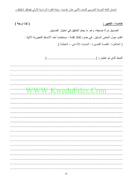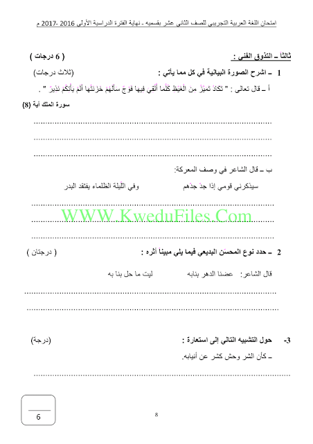 11ورقة في مادة اللغة العربية للصف الثاني عشر للكورس الاول تتضمن نموذج اجابة اختبار تجريبي