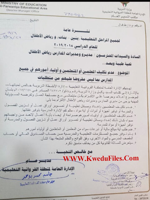 نشرة مدير منطقة الفروانية التعليمية بعدم تكليف المعلمين والمتعلمين واولياء الامور, أخبار, غير ذلك, الفصل الأول, 2018-2019 | ||