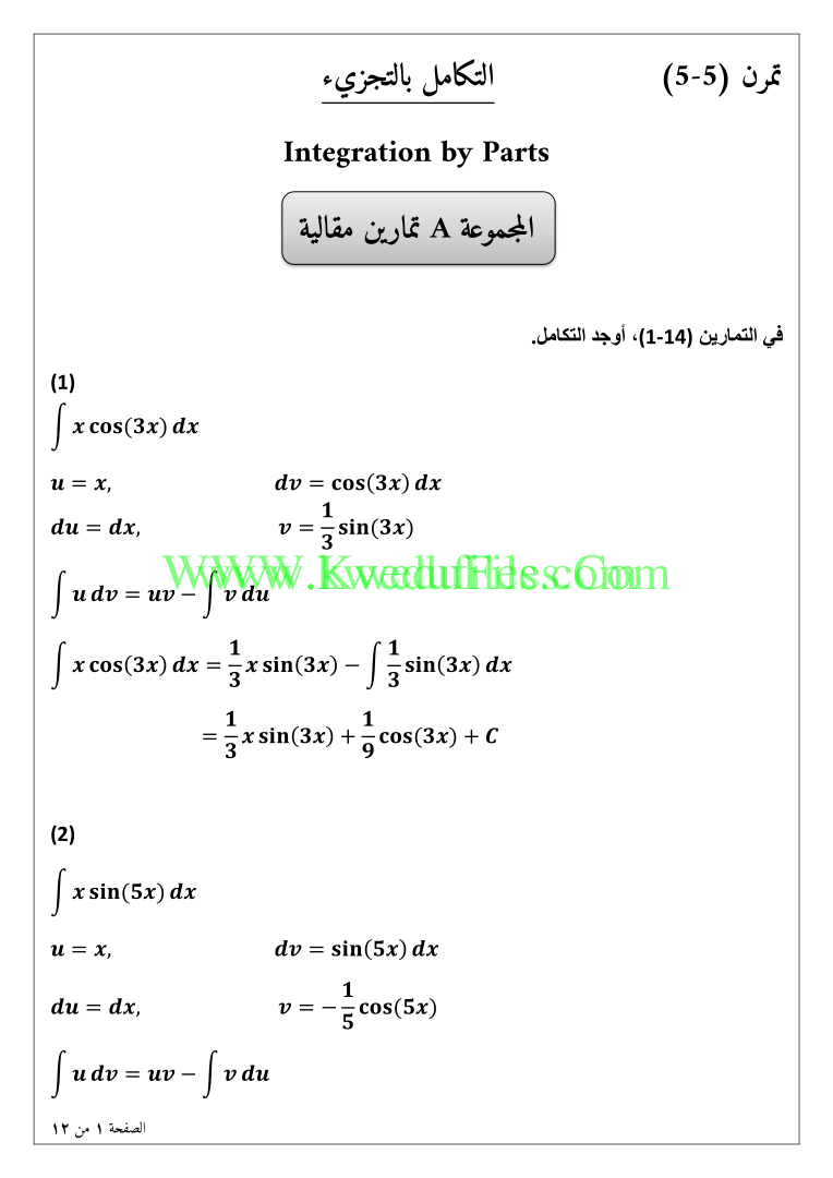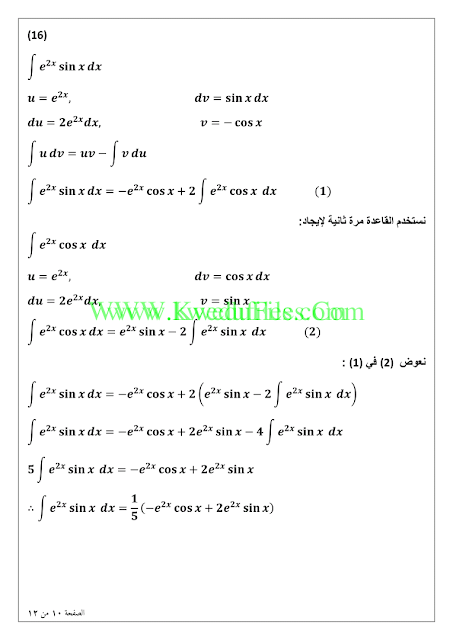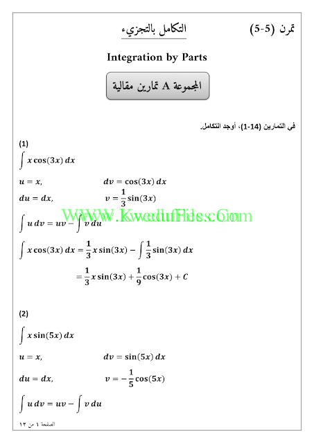 حل كراسة التمارين (التكامل بالتجزيء)في مادةالرياضيات