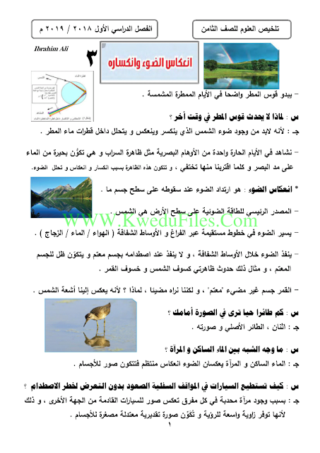 تلخيص الوحدة الثالثة (الانعكاس وانكسار الضوء)في مادة العلوم