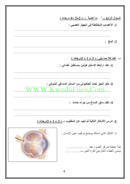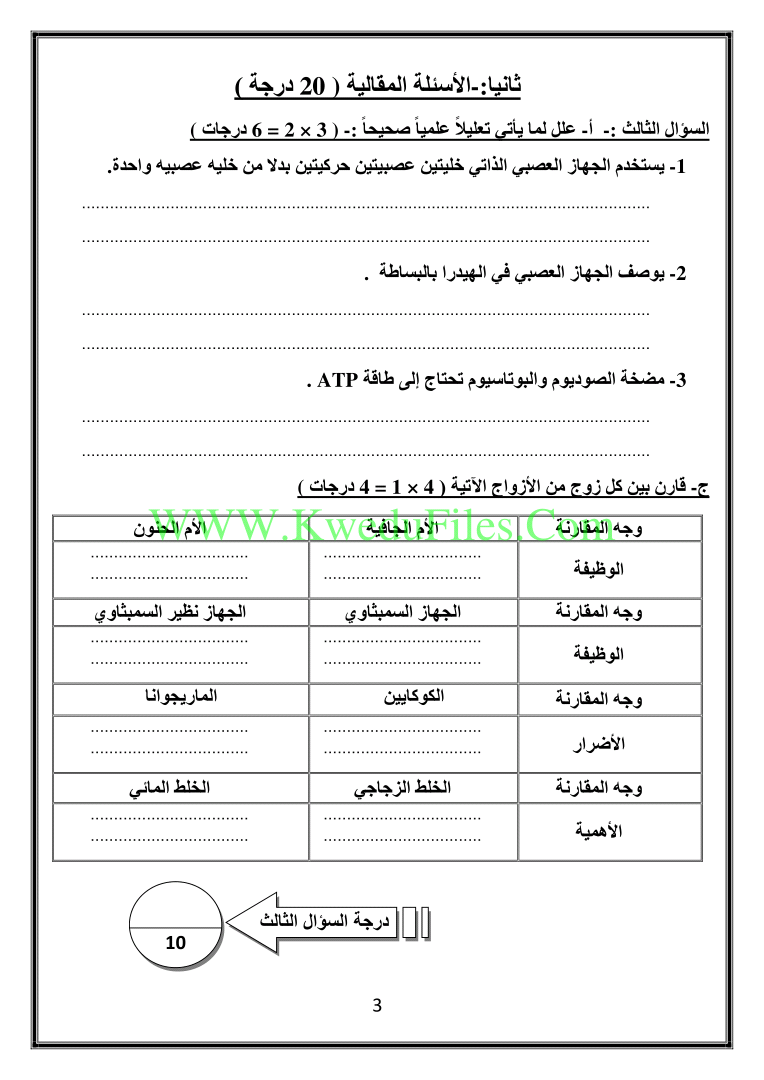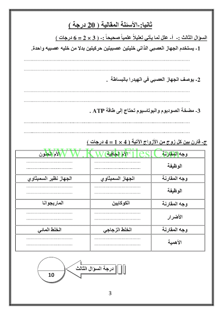 نموذج اجابة اختبارلنهاية الفترة الدراسية الاولى في مادة الاحياء(نموذج3)