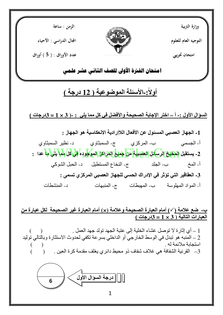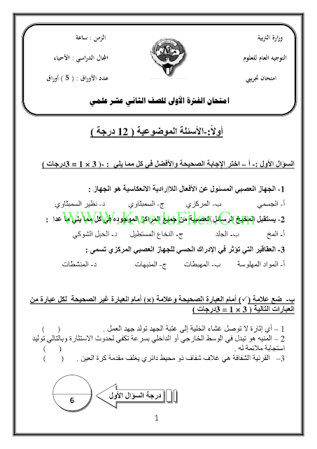 5اوراق في مادة الاحياء للصف الثاني عشر للكورس الاول تتضمن نموذج اجابة اختبار