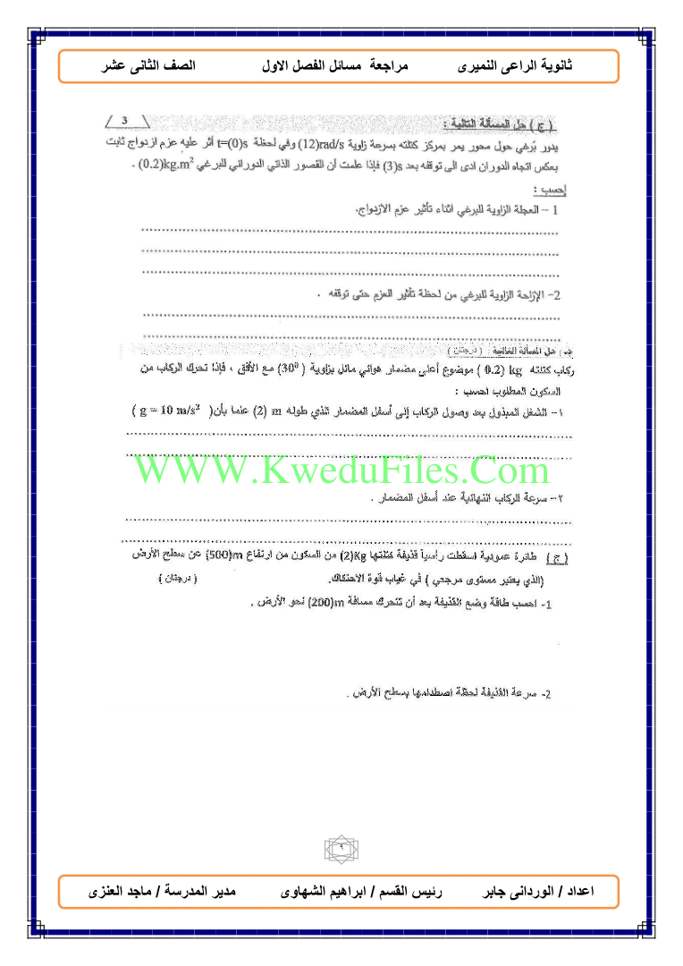 10اوراق في مادة الفيزياء للصف الثاني عشر للكررس الاول تتضمنمراجعةمسائل كورس اول