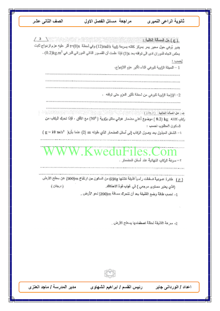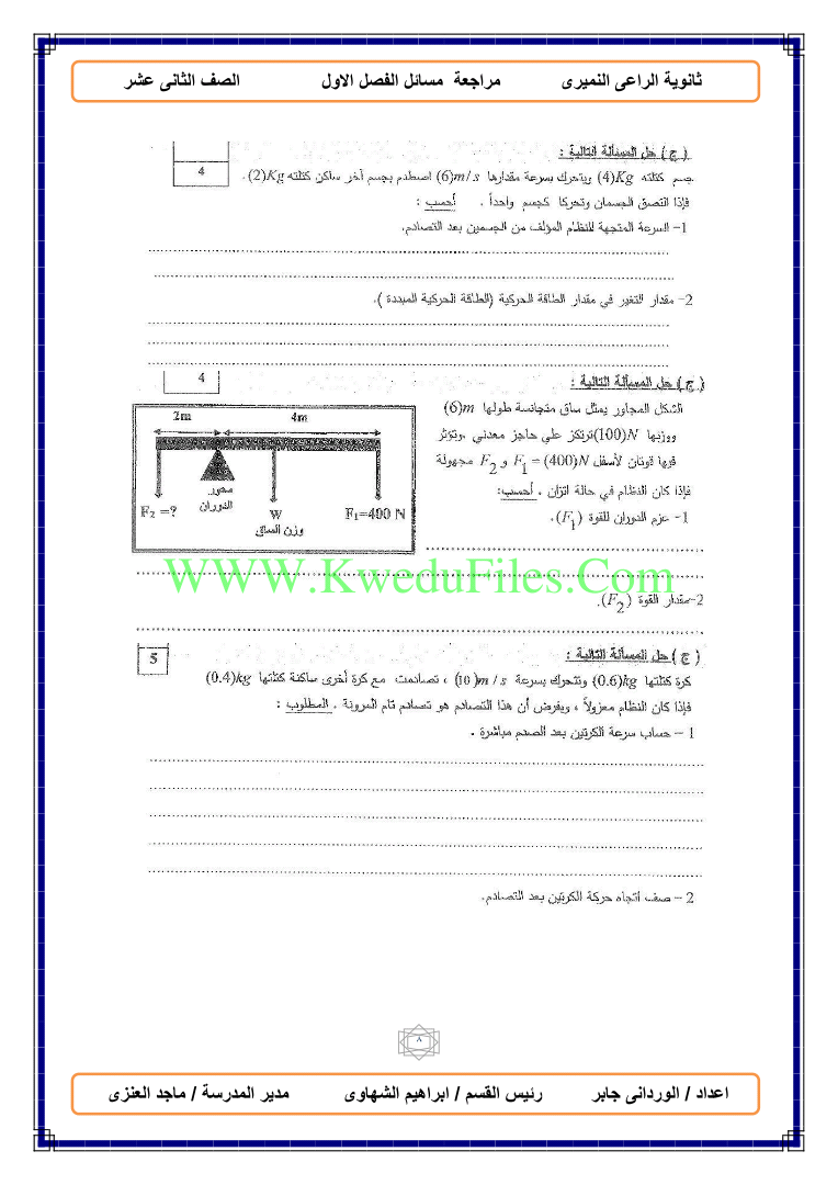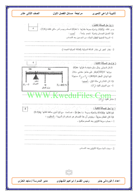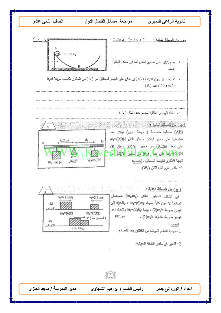 مراجعة مسائل كورس اول في مادة الفيزياء, الصف الثاني عشر العلمي, فيزياء, الفصل الأول, 2018-2019 - المناهج الكويتية