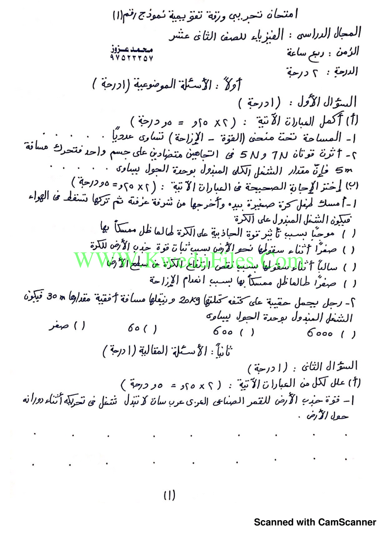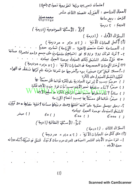 | نموذج اختبار (ورقة تقويمية)في مادة الفيزياء | ||
