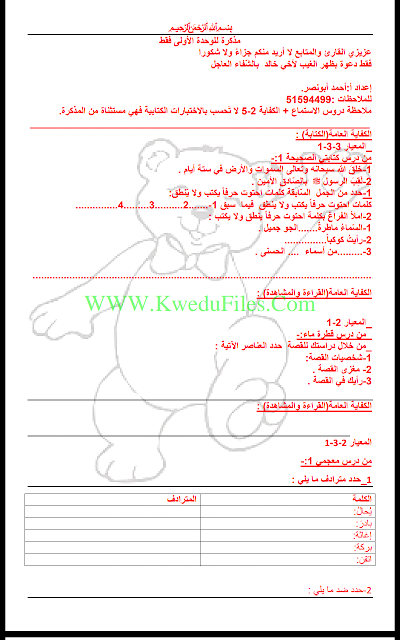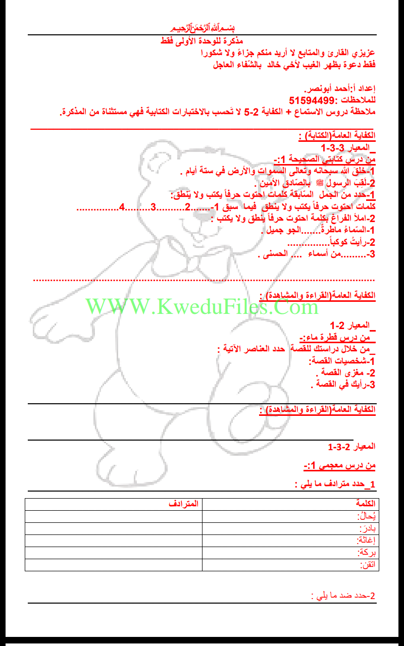 مذكرة للوحدة الاولى فقط في مادة اللغة العربية | ||