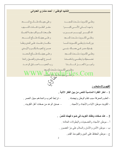 | مذكرة النشيد الوطني في مادة اللغة العربية | ||
