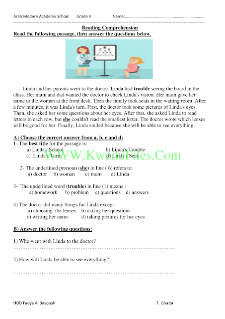 ورقة واحدة في مادة اللغة الانكليزية للصف الرابع للكورس الاول تتضمن ورقة استيعاب
