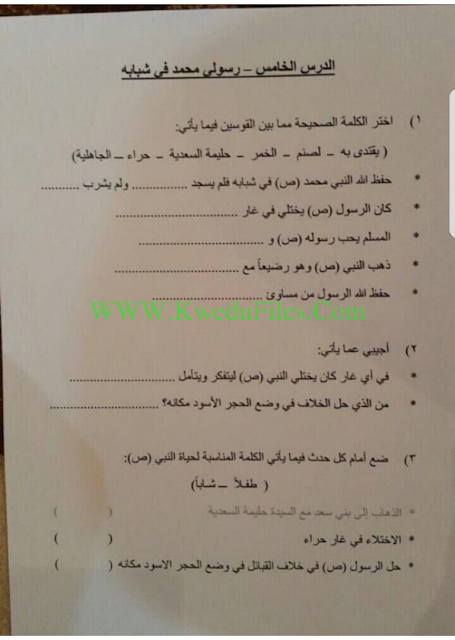 5. تربية اسلامية, الفصل الأول, 2025-2026, نموذج اختبار تجريبي حول الوضوء وفضل الرسول وآداب السلام