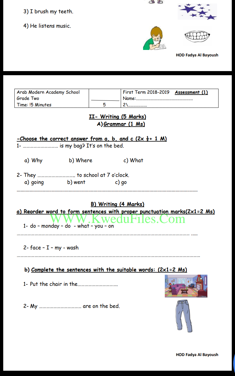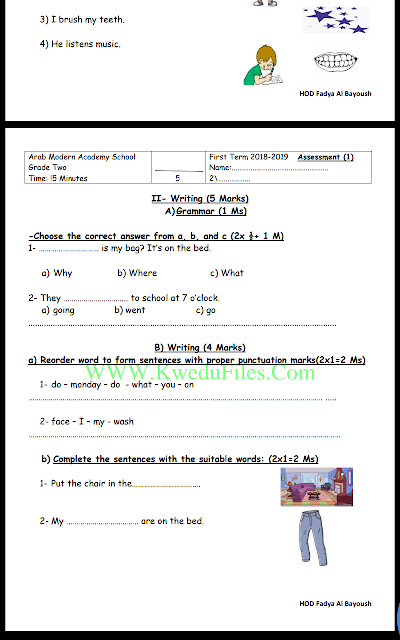 معلومات الملف: ورقتين في مادة اللغة الانكليزية للصف الثاني تتضمن نموذج امتحان لعام 2019 | ||