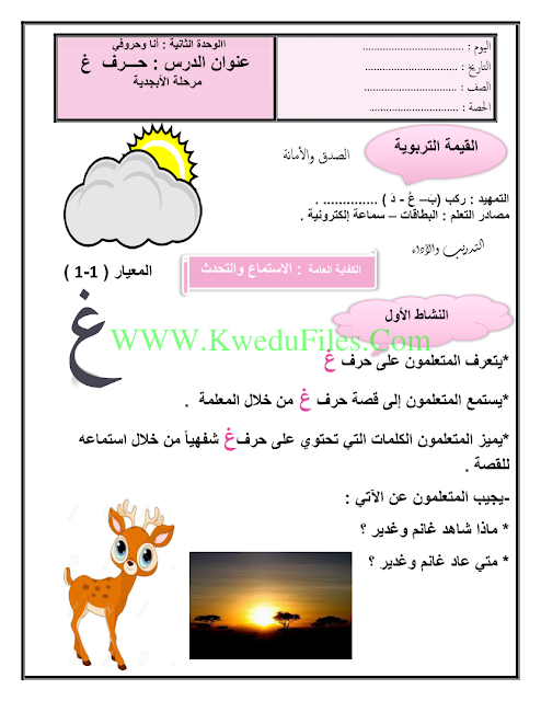 4اوراق في مادة اللغة العربية للصف الاول للكورس الاول تتضمن تدريبات على حرف الغين