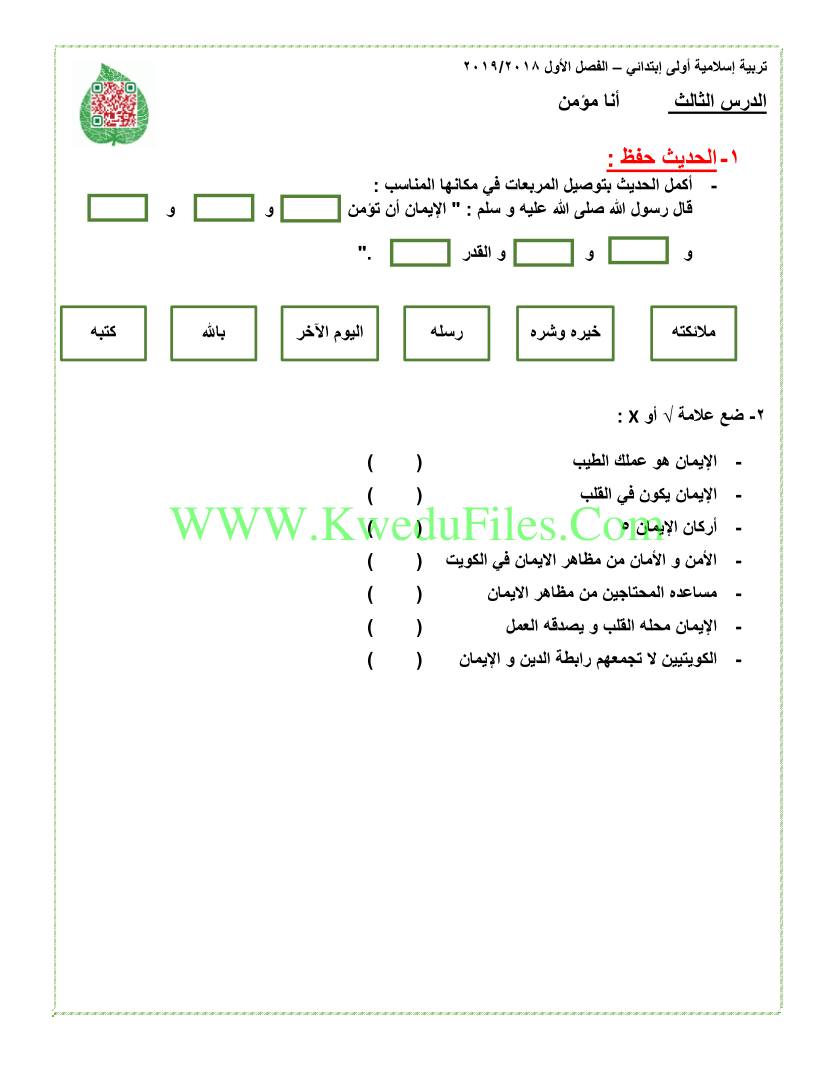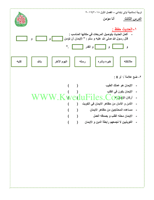 معلومات الملف: ورقة واحدة في مادة التربية الاسلامية للصف الاول للكورس الاول تتضمن الدرس الثالث (انا مؤمن) | ||