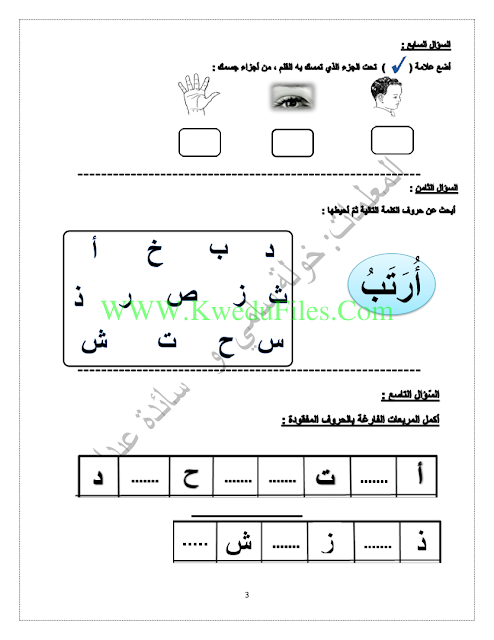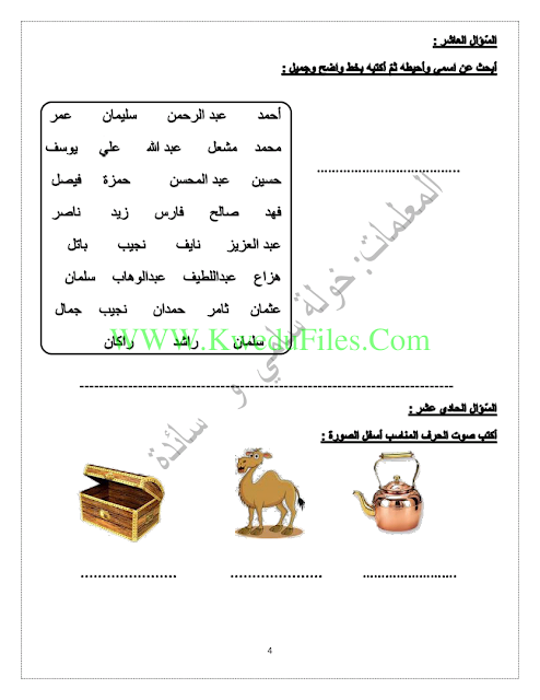4اوراق في مادة اللغة العربية للصف الاول تتضمن ورقات تدريبية لتيئة المعليمين للاختبار
