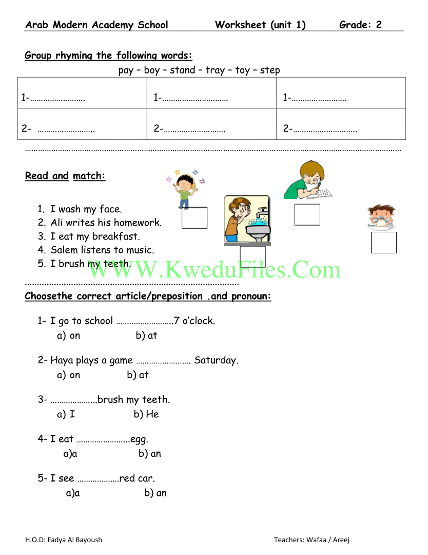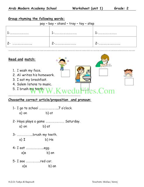 ورقتين في مادة اللغة الانكليزية للصف الثاني للكورس الاول تتضمن اوراق عمل مهمة