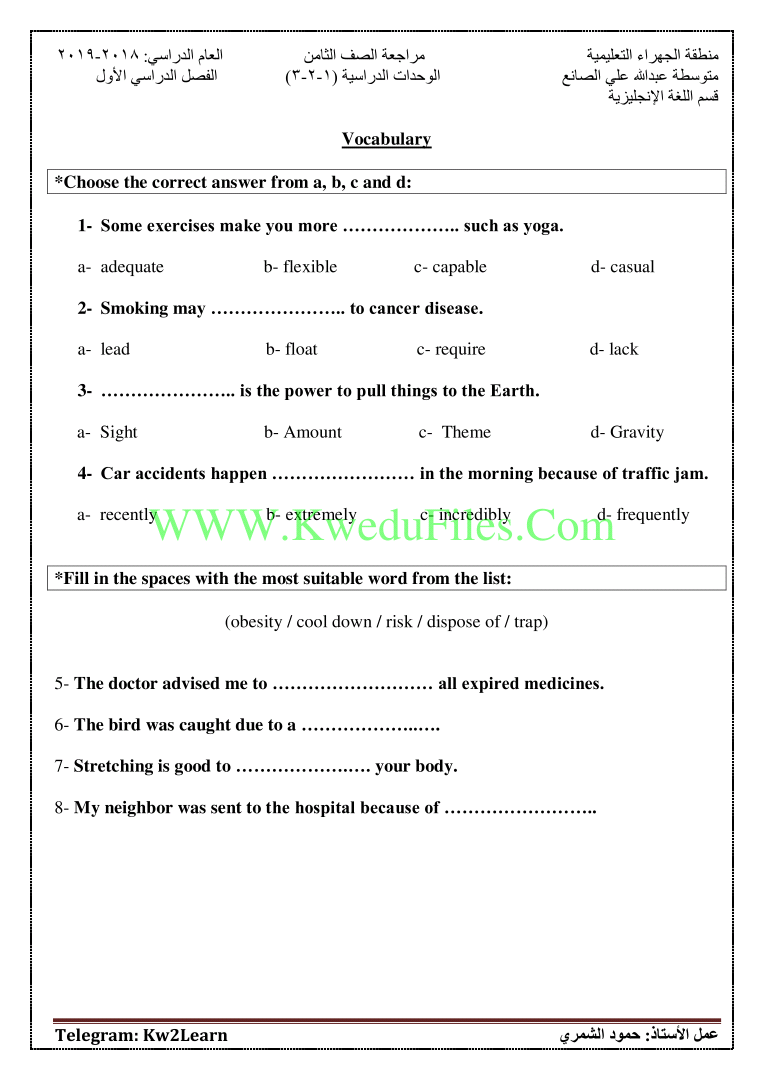 معلومات الملف: 5اوراق في مادة اللغة الانكليزية للصف الثامن للكورس الاول تتضمن نموذج اجابة اختبار لعام 2019 | ||