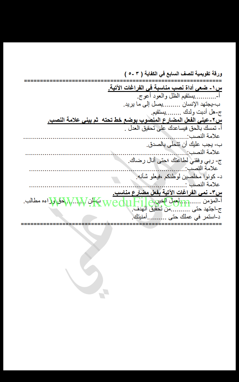 ورقة تقويمية لنصب الفعل المضارع في مادة اللغة العربية للصف السابع للكورس الاول