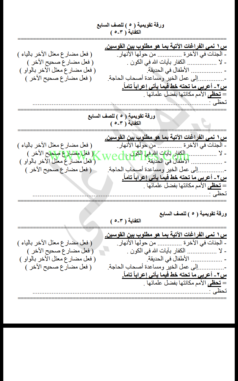 ورقة واحدة في مادة اللغة العربية للصف السابع للكورس الاول تتضمن ورقة تقويمية على الكفاية 3_5