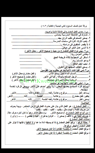 ورقة عمل في مادة اللغة العربية للصف السابع للكورس الاول تتضمن رفع الفعل المضارع