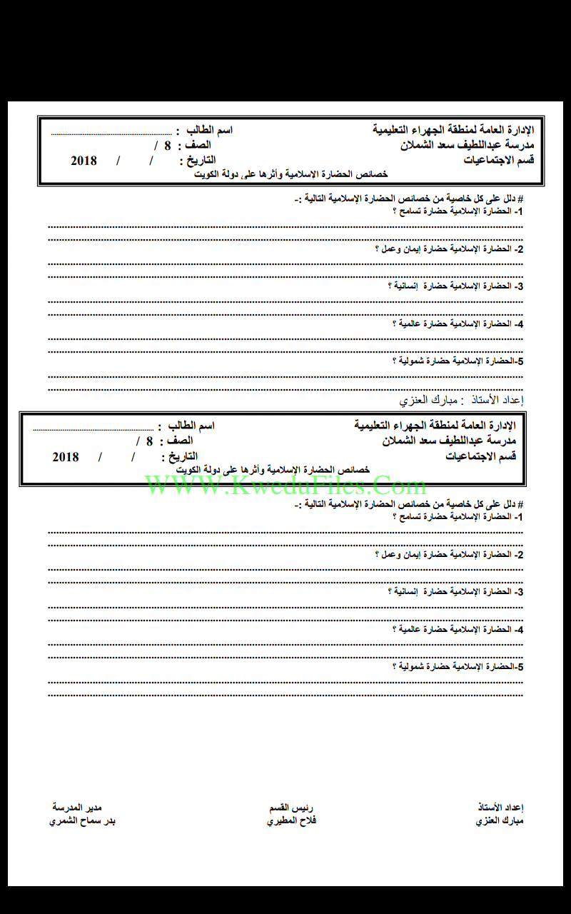 ورقة عمل خصائص الحضارة الاسلامية في مادة الاجتماعيات - إعداد: مبارك العنزي