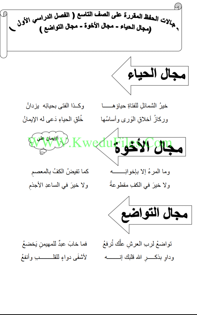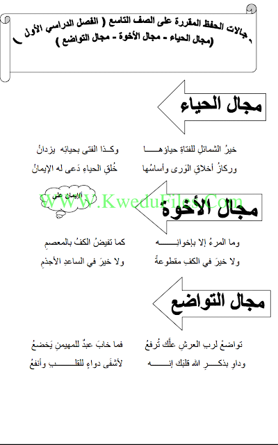 معلومات الملف: ورقة واحدة في مادة اللغة العربية للصف التاسع زلكورس الاول تتضمن مجالات الحفظ | ||
