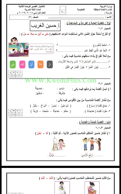 نموذج اختبار قصير في مادة اللغة العربية للوحدة الثانية من اعداد الاستاذ حسين الغريب للصف الثاني للكورس الاول عدد اوراق هذا الملف ورقتين