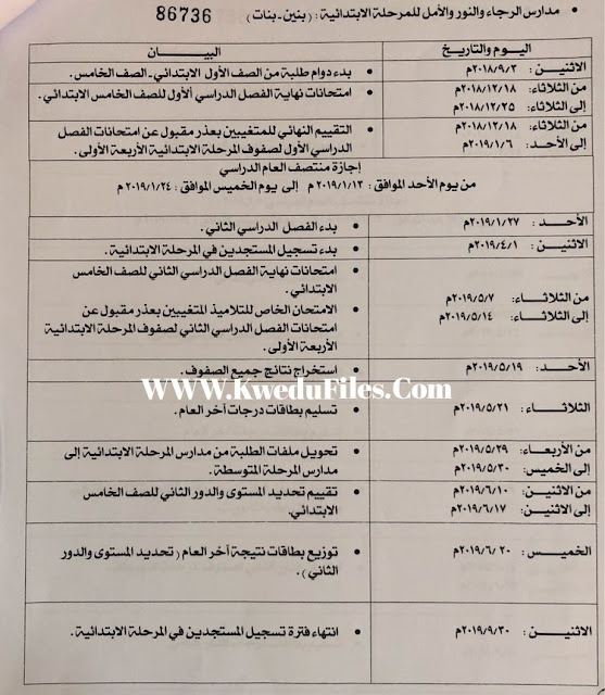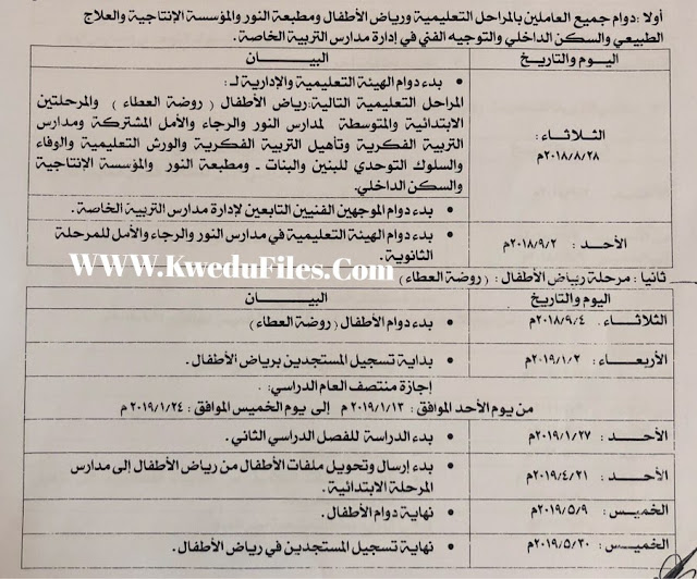 أصدر وكيل وزارة التربية بالإنابة يوسف النجار قرار بمواعيد الامتحانات و الإجازات لمدارس التربية الخاصة (بنين بنات) الحكومية في إدارة مدارس التربية الخاصة للعام الدراسي 2018/ بدء العام الدراسي 2018/م, أخبار, الامتحانات, الفصل الأول, 2018-2019 | ||