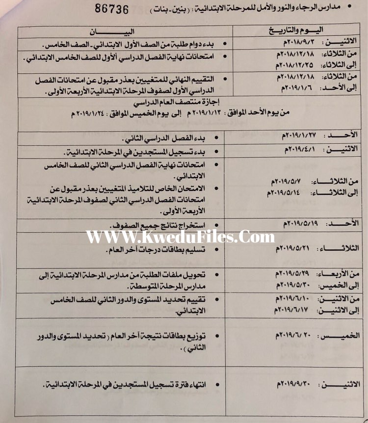 تم إيجاد الملف: أصدر وكيل وزارة التربية بالإنابة يوسف النجار قرار بمواعيد الامتحانات و الإجازات لمدارس التربية الخاصة (بنين بنات) الحكومية في إدارة مدارس التربية الخاصة للعام الدراسي 2018/ بدء العام الدراسي 2018/م