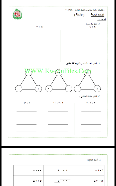 اسئلة الوحدة الرابعة في مادة الرياضيات | ||
