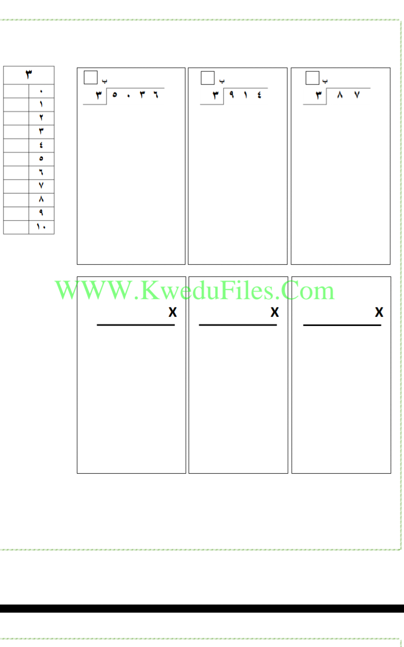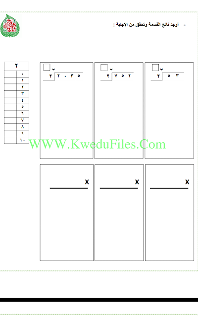 معلومات الملف: 9اوراق في مادة الرياضيات للصف الرابع للكورس الاول تتضمن تدريبات على القسمة | ||