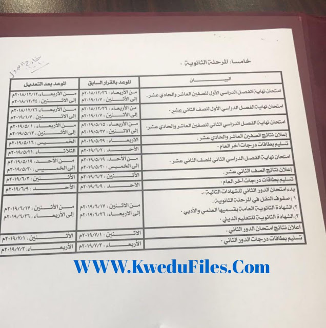 مقترح تعديل موعد الاختبارات للمرحلة الثانوية, أخبار, الامتحانات, الفصل الأول, 2018-2019