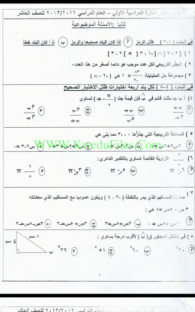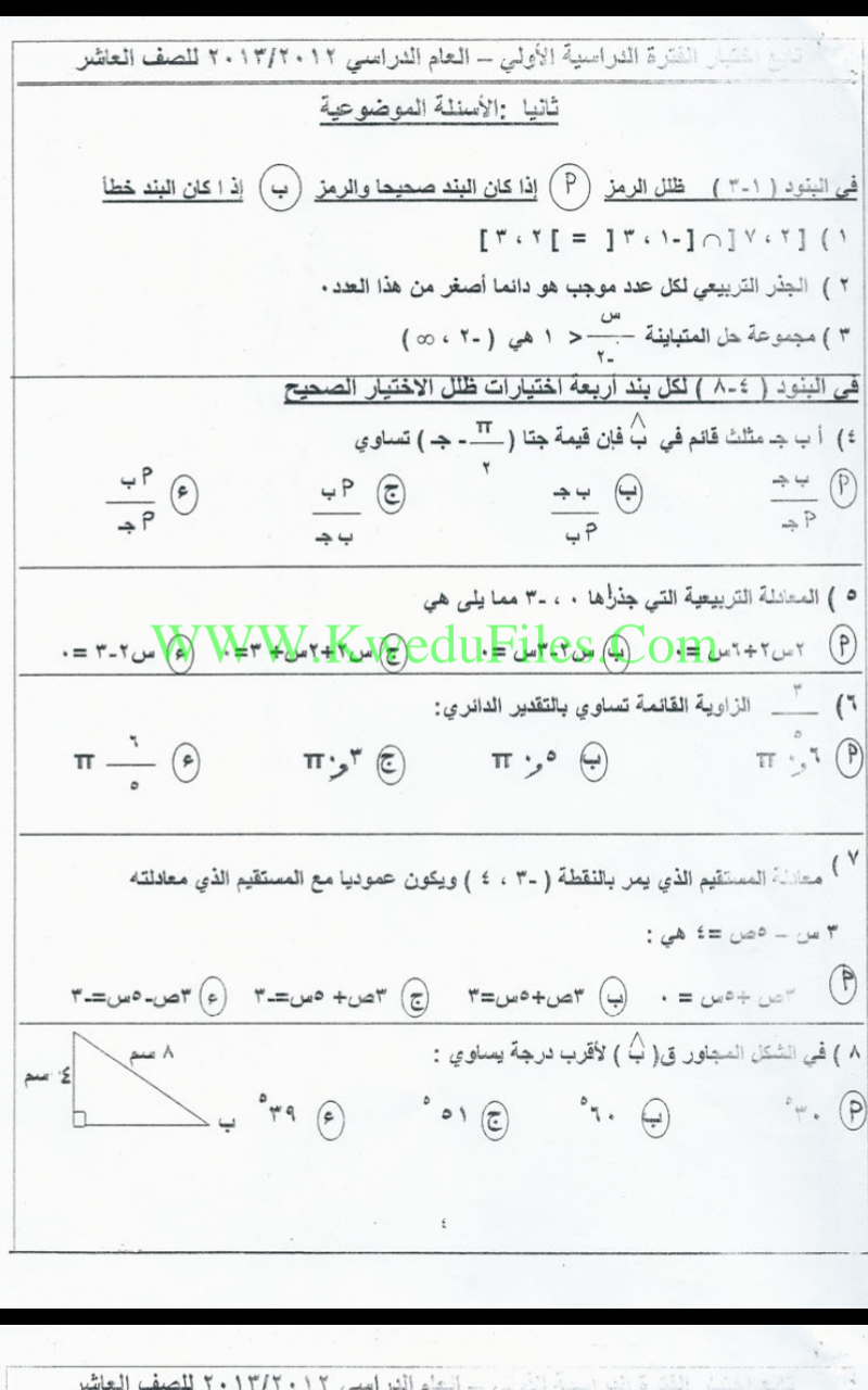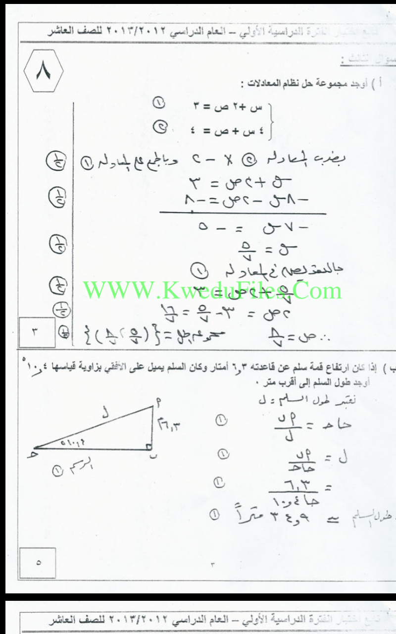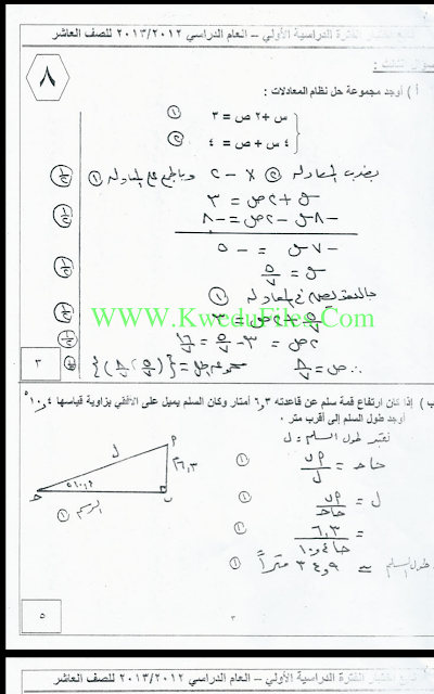 5اوراق في مادة الرياضيات للصف العاشر للكورس الاول تتضمن نموذج اجابة اختبار لعام 2012_2013