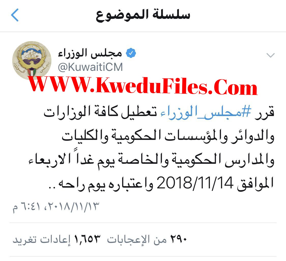 تم إيجاد الملف: قرر مجلس_الوزراء تعطيل كافة الوزارات والدوائر والمؤسسات الحكومية والكليات والمدارس الحكومية والخاصة يوم غداً الاربعاء الموافق 2018/11/14 واعتباره يوم راحه ..