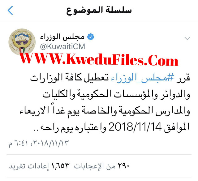 .قرر مجلس_الوزراء تعطيل كافة الوزارات والدوائر والمؤسسات الحكومية والكليات والمدارس الحكومية والخاصة يوم غداً الاربعاء الموافق 2018/11/14 واعتباره يوم راحه .. | ||