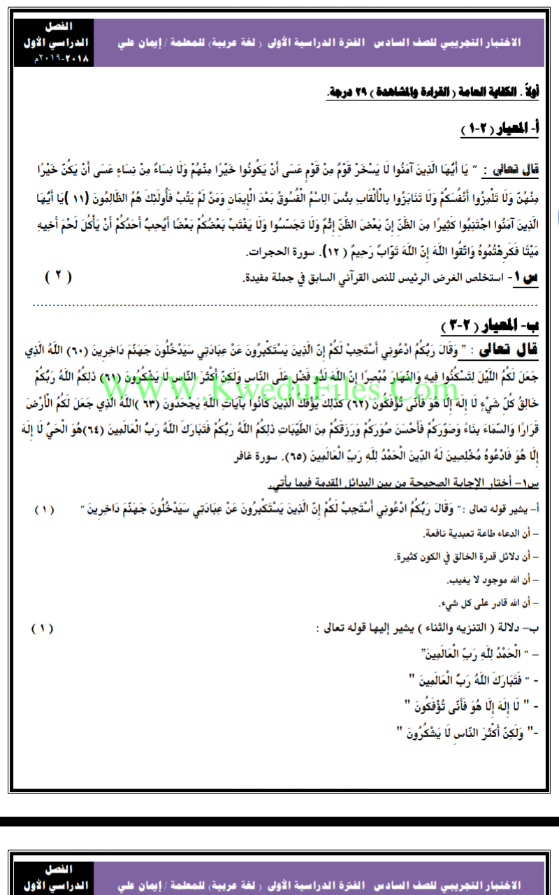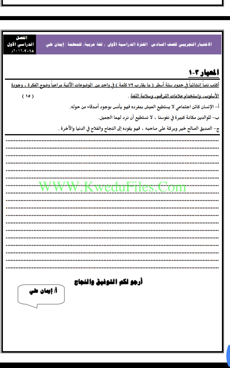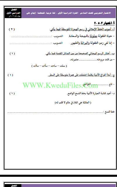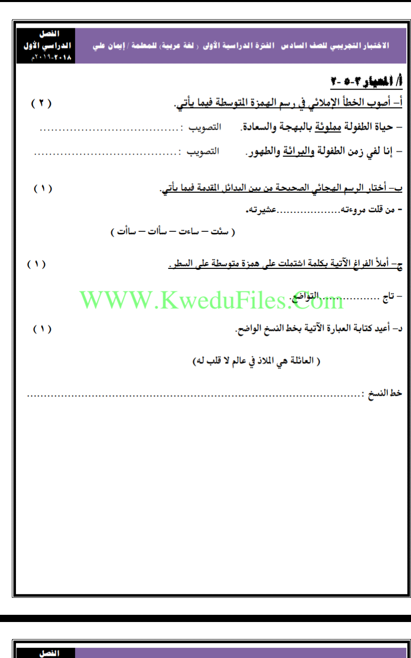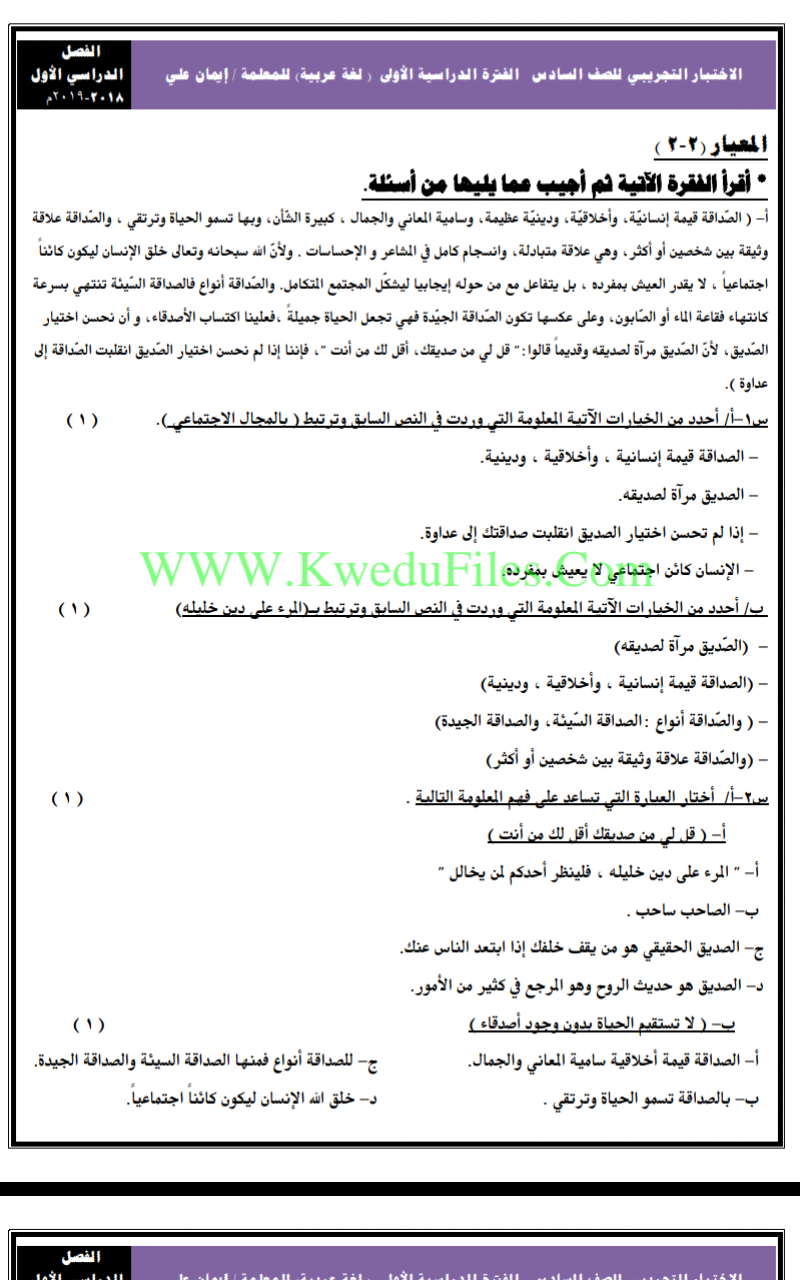 معلومات الملف: 9اوراق في مادة اللغة العربية للصف السادس للكورس الاول تتضمن الاختبار التجريبي من اعداد المعلمة ايمان علي | ||