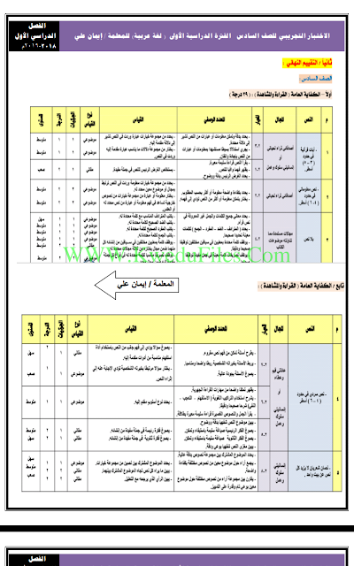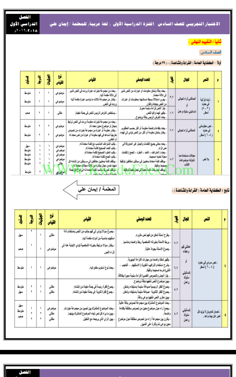 9اوراق في مادة اللغة العربية للصف السادس للكورس الاول تتضمن الاختبار التجريبي من اعداد المعلمة ايمان علي