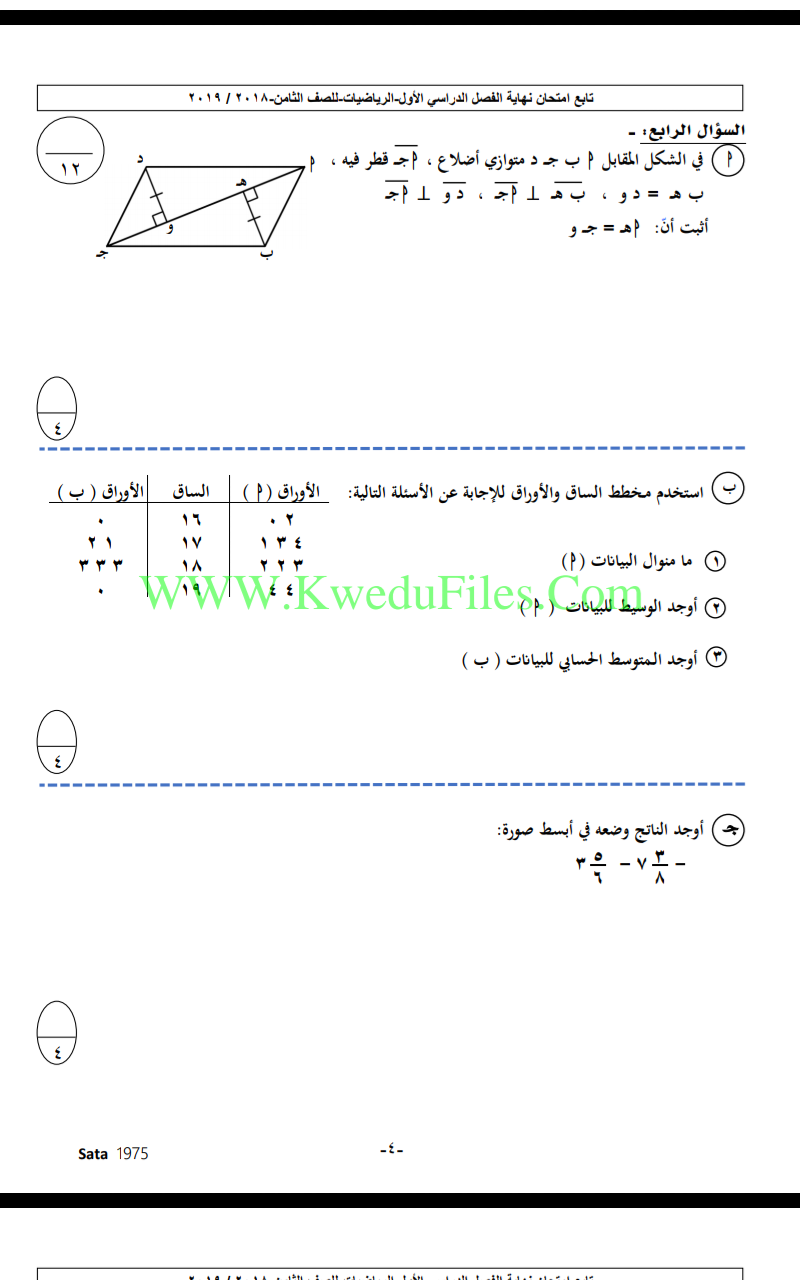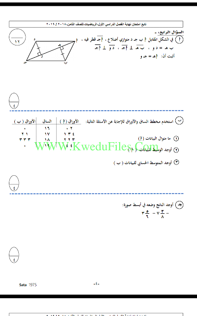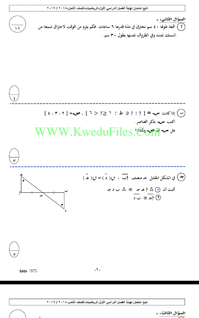 7اوراق في مادة الرياضيات للصف الثامن للكورس الاول تتضمن نموذج اختبار تابع للادارة العامة لمنطقة الجهراء للعام 2018_2019