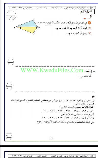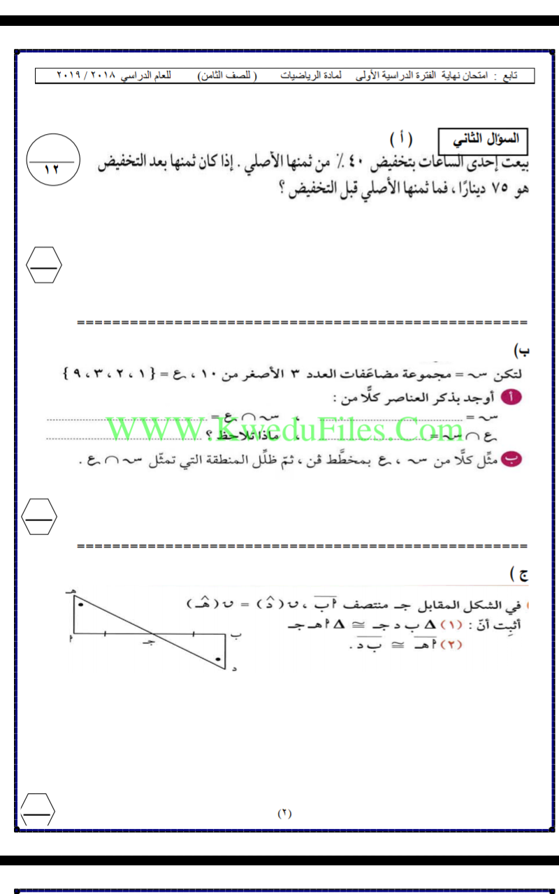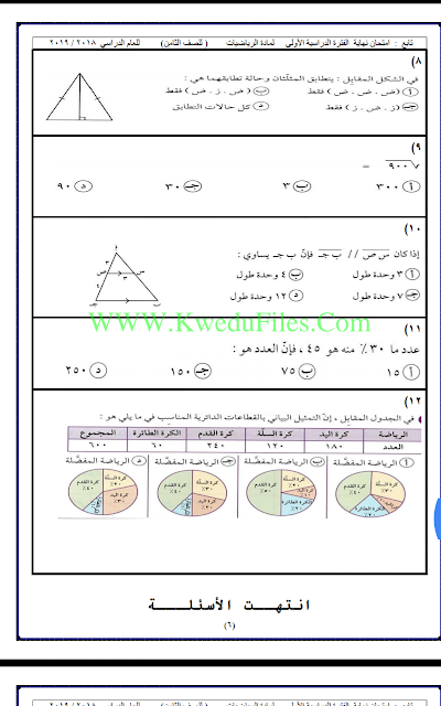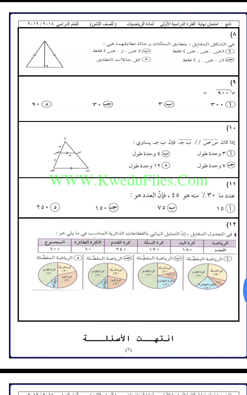 معلومات الملف: 8اوراق في مادة الرياضيات للصف الثامن للكورس الاول تتضمن نموذج اختبار لعام 2018_2019 | ||