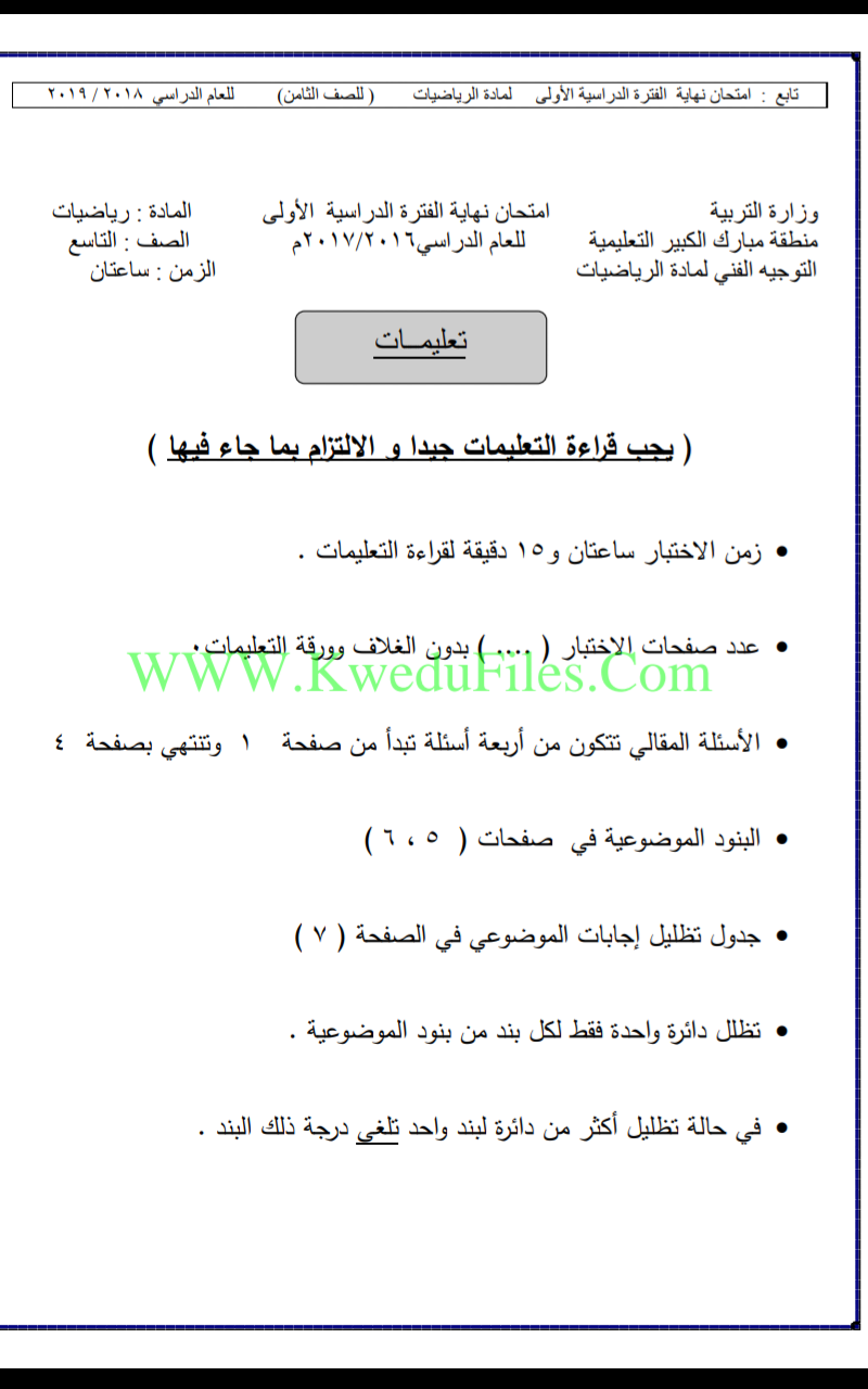 نموذج اختبار لعام 2018_في مادة الرياضيات - إعداد: منطقة مبارك الكبير التعليمية | ||