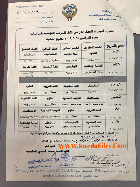 جدول اختبارات المرحلة المتوسطة لمنطقة الأحمدي لعام 2018_, أخبار, الامتحانات, الفصل الأول, 2018-2019 | ||
