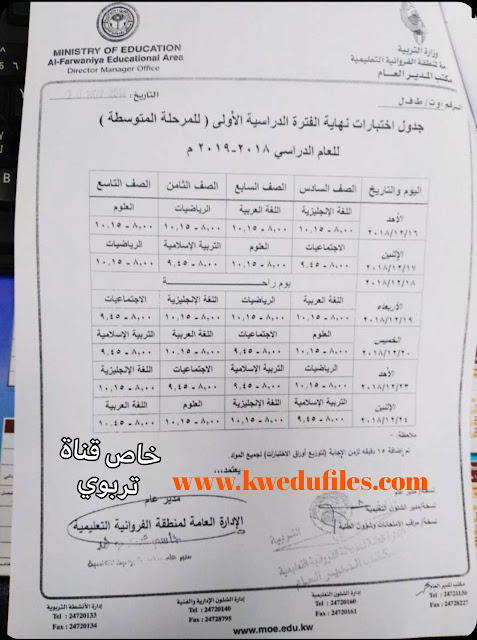 .جدول اختبارات المرحلة المتوسطة لمنطقة الفروانية التعليمية لعام 2018_2019 | ||