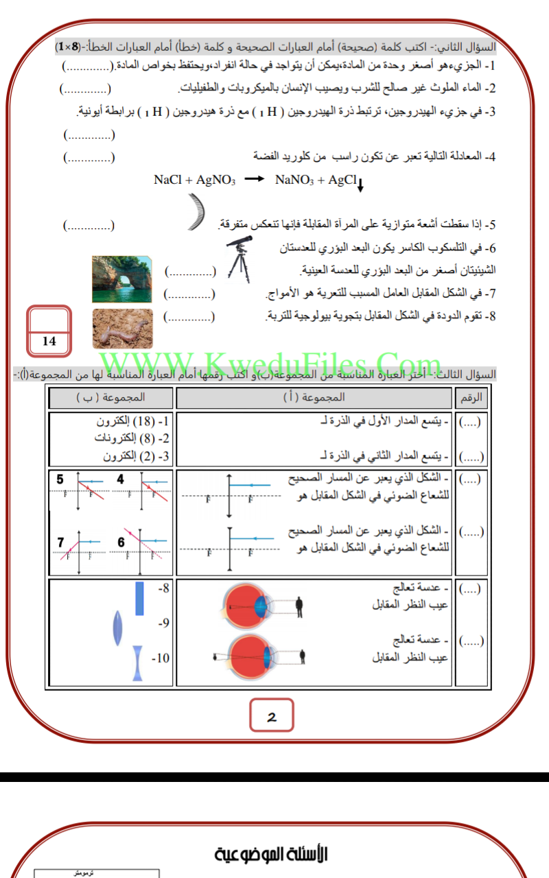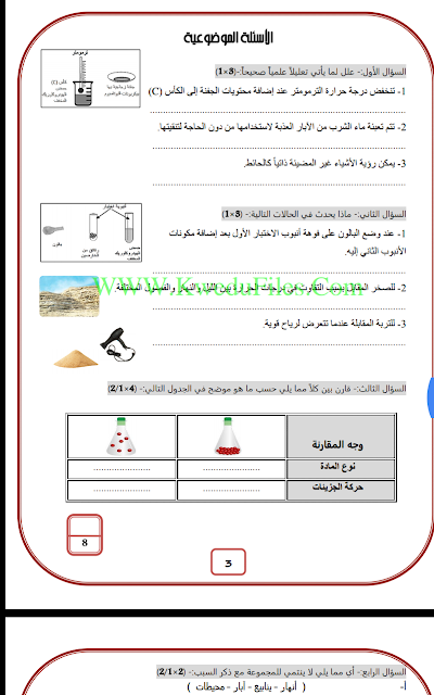 5اوراق في مادة العلوم للصف الثامن للكورس الاول تتضمن نموذج اختبار
